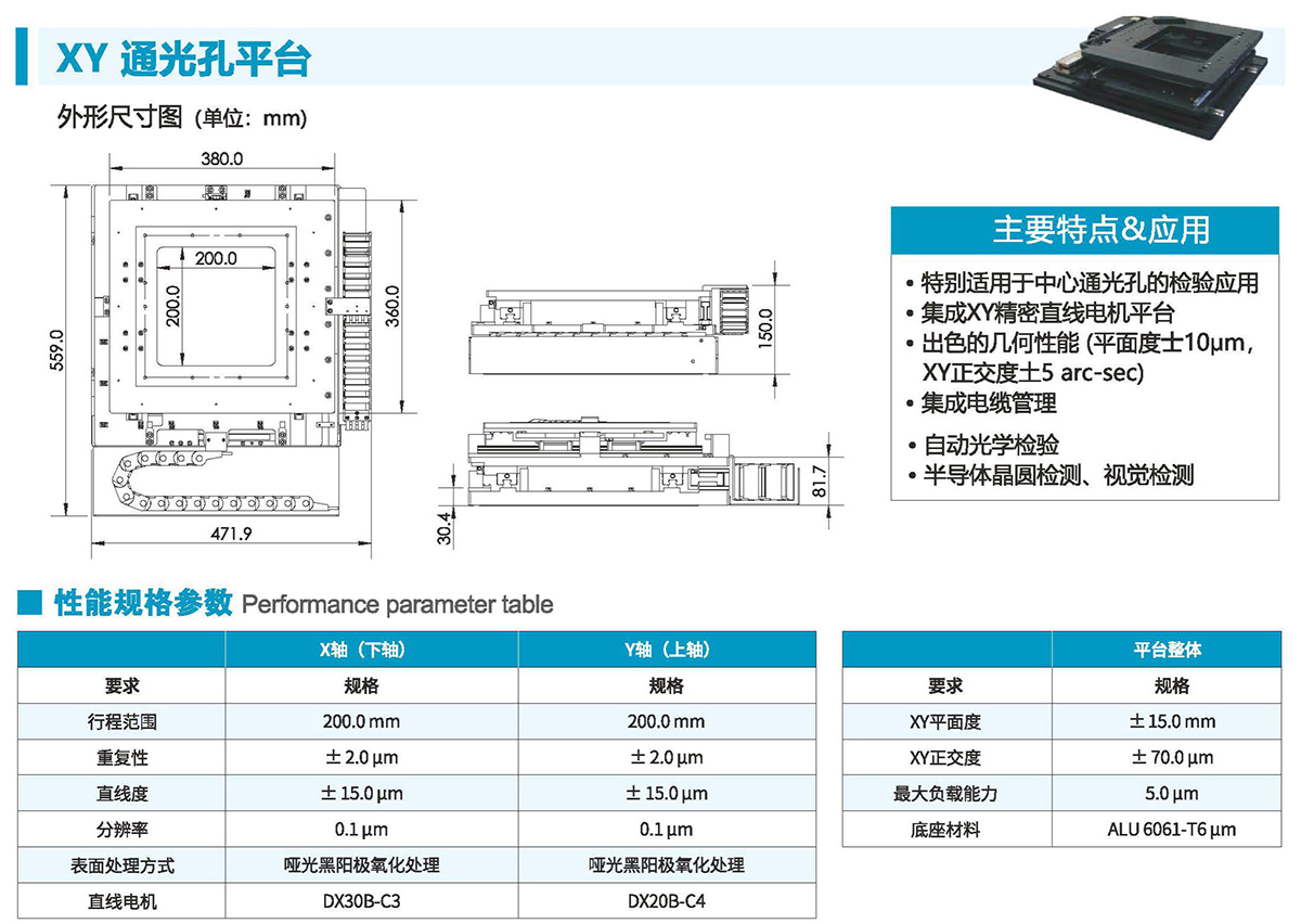 ●出色的几何性能(平面度士10um,XY正交度土5arc-sec)