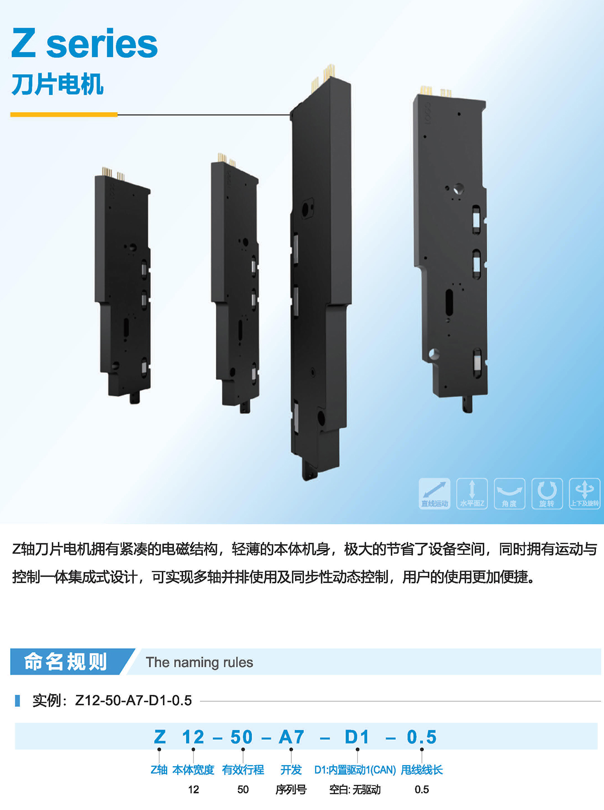 Z轴刀片电机拥有紧凑的电磁结构,轻薄的本体机身,极大的节省了设备空间,同时拥有运动与控制一体集成式设计,可实现多轴并排使用及同步性动态控制,用户的使用更加便捷。