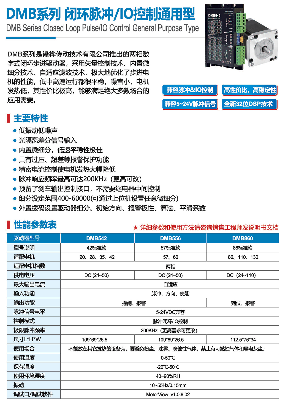 DMB系列是锋桦传动技术有限公司推出的两相数字式闭环步进驱动器,采用矢量控制技术、内置微细分 技术、自适应滤波技术,极大地优化了步进电机的性能,低中高速运行都很平稳,噪音小,电机发热低 ,其性价比极高,能够满足绝大多数场合的应用需要。